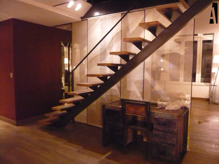Le duplex a été repensé en favorisant les perspectives et la fluidité des déplacements. L’espace est décloisonné pour offrir une modularité d’usage, ainsi la chambre est délimitée subtilement par des panneaux de tissus, la cuisine ouverte s’intègre par sa façade rainurée, tandis que le salon à l’étage s’ouvre sur une terrasse de 200m². Les rangements et les dressing ont été réalisés sur-mesure afin de répondre aux attentes du maître d’ouvrage. La terrasse est composée tel un jardin où la végétation occupe une place d’honneur créant un lieu hors du temps.